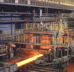 這里所示的是正在鑄造的扁鋼錠。 鋼水被不斷地倒入沒(méi)有底部的鑄模中。 當(dāng)鑄模被拉動(dòng)時(shí),鋼鐵就開(kāi)始與鑄模的水冷內(nèi)壁接觸,并開(kāi)始凝固。 然后,鑄造好的金屬由一連串的輥筒引導(dǎo)被向下拉,同時(shí)持續(xù)得到冷卻。 當(dāng)它到達(dá)末端時(shí),鋼鐵已完全凝固,并立刻被切成所需的長(zhǎng)度。