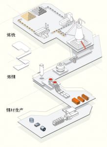 在高爐中,從鐵礦石中提取鐵。固態(tài)的礦石和焦炭由頂部加入高爐,而高爐底部送來(lái)的一股熱氣(1200℃)致使幾乎是100%含炭量的焦炭開(kāi)始燃燒。 這便產(chǎn)生了碳的氧化物,它通過(guò)除氧過(guò)程來(lái)減少了氧化鐵,從而分離出鐵。 由燃燒產(chǎn)生的熱量將鐵和脈石(礦石中礦物的集合)熔化成液體。 脈石,由于比較輕,會(huì)漂浮至鐵水表面,就是所謂的“生鐵”。爐渣是熔融脈石產(chǎn)生的殘?jiān)捎糜谄渌I(yè)用途,比如用于鋪設(shè)道路或生產(chǎn)水泥。
