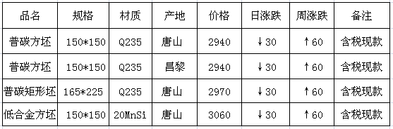 矩形方坯現金含稅價為2970元/噸,低合金方坯20Mnsi現金含稅價3060元/噸。