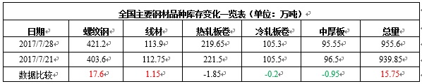 縱觀全國市場,本期全國35個主要市場螺紋鋼庫存量為421.2萬噸,增加17.6萬噸,增幅為4.36%;線材庫存量為113.9萬噸,增加1.15萬噸,增幅為1.02%。而從全國線材、螺紋鋼、熱軋板卷、冷軋板卷、中厚板五大品種庫存總量來看,本期全國綜合庫存總量為955.6萬噸,較前一周增加15.75萬噸,增幅為1.68%。總體來看,全國鋼材市場庫存連續第二周上升,且升幅較上周有所擴大,目前的庫存水平較去年同期增加63.2萬噸,增幅7.08%。隨著鋼價上漲至高位,下游用戶及中間商開始出現一定的恐高心理,成交繼續趨弱,庫存繼續累積。