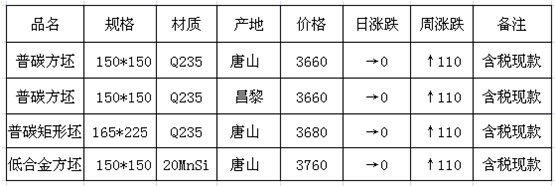 唐山鋼坯:截止16:00發稿,唐山部分普碳鋼坯報價平穩,現含稅出廠價3660元/噸,矩形方坯現金含稅價為3680元/噸,低合金方坯20Mnsi現金含稅價3760元/噸。