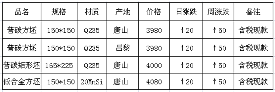 唐山鋼坯:截止16:00發稿,唐山部分普碳鋼坯上漲20元/噸,現含稅出廠價3980元/噸,矩形方坯現金含稅價為4000元/噸,低合金方坯20Mnsi現金含稅價4080元/噸。