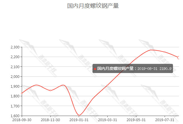 最新數據顯示,2019年8月份,我國鋼筋產量為2190.9萬噸,同比增長17.1%;1-8月累計產量為16410.2萬噸,同比增長20.5%。