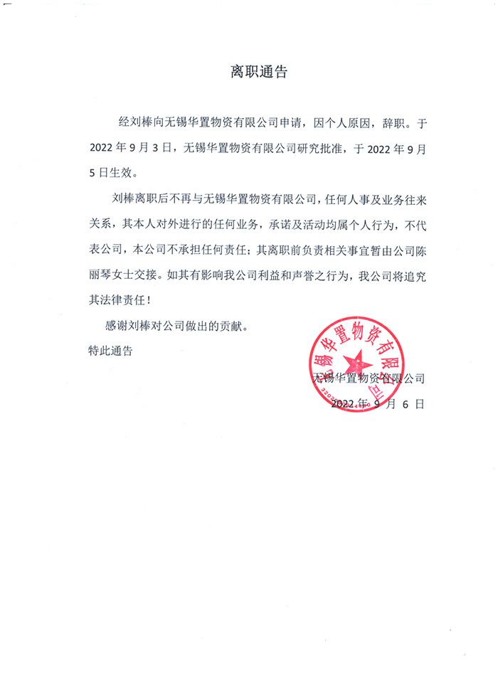 劉棒離職后不再與無錫華置物資有限公司,任何人事及業(yè)務(wù)往來關(guān)系,其本人對外進行的任何業(yè)務(wù),承諾及活動均屬個人行為,不代表公司,本公司不承擔(dān)任何責(zé)任;其離職前負責(zé)相關(guān)事宜暫由公司陳麗琴女士交接。如其有影響我公司利益和聲譽之行為,我公司將追究其法律責(zé)任!