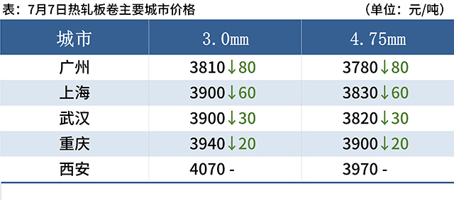 熱軋板卷:7月7日,全國24個主要城市4.75mm熱軋板卷均價3892元/噸,較上個交易日下跌25元/噸。隨著午后盤面跳水的刺激,現(xiàn)貨價格跟跌,但幅度較小,市場觀望情緒較強(qiáng)。本周表需下滑,市場小幅累庫,基本面無明顯變化,但由于周五期貨尾盤跳水,市場觀望情緒增加,且進(jìn)入7月傳統(tǒng)消費淡季,需求端難有顯著轉(zhuǎn)好跡象。后期仍需關(guān)注終端需求量以及政策面等相關(guān)消息。預(yù)計下周全國熱軋板卷價格或?qū)⒄鹗幤踹\行。