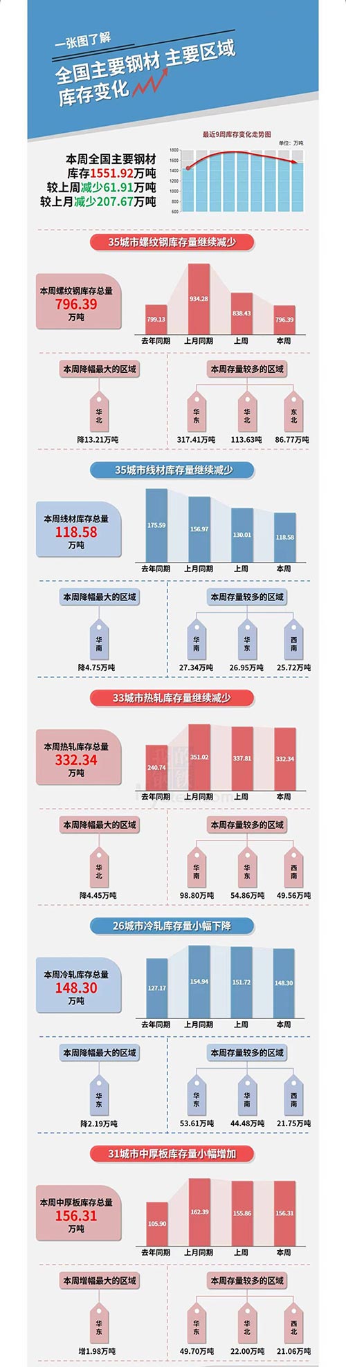 據(jù)相關(guān)報(bào)道:本周2024年4月5日-11日,全國(guó)主要鋼材社會(huì)庫(kù)存1551.92萬(wàn)噸,較上周減少61.91萬(wàn)噸,較上月減少207.67萬(wàn)噸;其中螺紋鋼庫(kù)存總量796.39萬(wàn)噸,方管等鋼管基本持平。