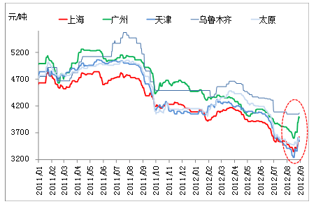 除了不同鋼材品種間存在差異之外,本輪反彈也表現(xiàn)出一定的區(qū)域性特征。圖2對比了不同城市間螺紋鋼價(jià)格走勢的差異,可以發(fā)現(xiàn)廣州、天津等市場價(jià)格變化較大,而烏魯木齊、太原等市場表現(xiàn)則相對平穩(wěn)。從數(shù)據(jù)來看,自9月10日左右螺紋鋼啟動上漲至今,廣州上漲幅度最大,達(dá)到了400元/噸;天津次之,漲幅也達(dá)到了350元/噸;太原、烏魯木齊漲幅相對較小,僅分別上漲70元/噸和20元/噸。將漲幅最大的廣州和漲幅最小的烏魯木齊進(jìn)行對比,兩個(gè)城市上漲的幅度差距高達(dá)380元/噸。