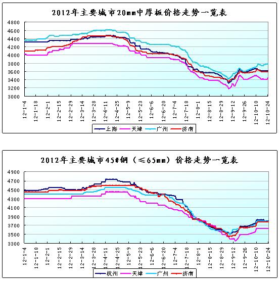 10月份,國內(nèi)鋼市整體呈現(xiàn)了先揚后抑、震蕩上行的走勢。節(jié)日期間,國內(nèi)公布的PMI制造業(yè)指數(shù)在“4連陰”后出現(xiàn)回升,鋼坯價格長假也出現(xiàn)170元/噸的大漲,節(jié)后部分工地采購以及貿(mào)易商補庫帶動需求有所放量,主要品種價格快速拉漲,鋼市實現(xiàn)“開門紅”。但隨著價格上漲,終端及中間商采購減少、市場成交趨弱,在市場庫存明顯增加、下游需求實質(zhì)性改善有限的情況下,部分獲利商家出貨意愿增加,鋼價下行壓力增大。中旬武鋼、寶鋼、沙鋼等主導(dǎo)鋼廠新一輪出廠價穩(wěn)中有漲,9月經(jīng)濟數(shù)據(jù)略微轉(zhuǎn)好,一定程度上限制了鋼價下跌空間。截止24日,上海市場螺紋鋼主流報價3720-3750元/噸,較上月末上漲70-80元/噸;上海市場厚規(guī)格熱卷主流報價3740-3760元/噸,較上月末上漲130元/噸;華東市場中板主流報價3580-3620元/噸,較上月末上漲20元/噸;華東市場45#主流報價3780-3850元/噸,較上月末上漲130-150元/噸。