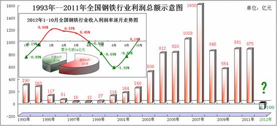 據最新數據顯示,中國鋼鐵行業在今年的前10個月中,經營虧損月份達到了6個月,剛好占60%,僅3、4、5、10月有1%不到的微利,累計虧損34億元。這表明,投資收益已經難掩鋼鐵行業實際虧損的困境。(見下圖)