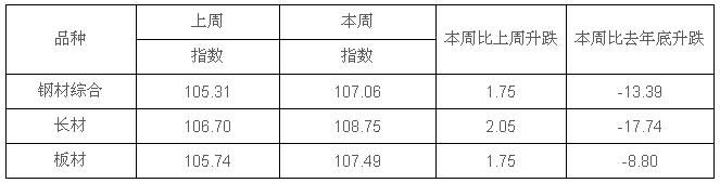 中國國內鋼市最新鋼材綜合價格指數和板材、長材價格指數(含稅)統計表如下: