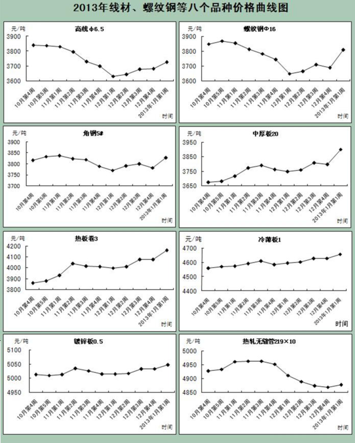 注:一.2012年12月年尾國際鋼鐵市場鋼材綜合價格指數為175點,比上月上升4.2點;長材價格指數為194.6點,上升6.8點;板材價格指數為165.2點,上升2.8點。