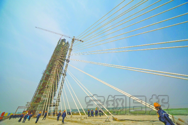如皋長江大橋于2010年8月開工建設,投資5.6億元,采用雙塔斜拉橋設計。竣工通車后,如皋長江大橋將連接蘇南沿江高速公路,通達蘇南各大城市,成為如皋乃至蘇北地區承南啟北的重要交通干線。圖為如皋長江大橋建設者從85米高的主塔及斜拉索前走過。