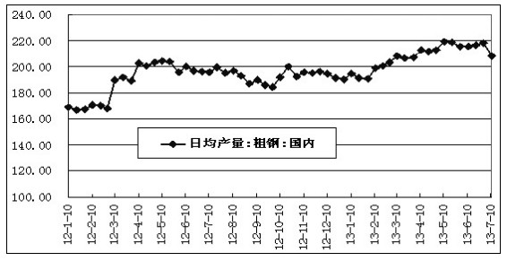 進入2013年,鋼廠基本處于持續虧損的境地,主要原因在于礦價的漲幅明顯高于鋼價,而下行的力度小于鋼價,鋼企的成本壓力較大。由于產能過剩的原因,以及鋼鐵企業普遍存有“寧可丟掉效益也不能丟掉市場”的心態,鋼鐵產量持續處于高位。近期,伴隨著國家環保治理力度的加大,鋼廠季節性檢修等因素影響,鋼鐵供給壓力明顯減輕。據中鋼協最新數據,預估7月上旬全國日均產量為208.30萬噸,環比大幅下降4.50%。近期鋼材價格雖然出現上漲,鋼鐵企業盈利能力也在好轉,但是經歷長時間虧損之后,鋼企挺價意愿也在進一步增強,主流鋼企紛紛上調出廠價格。另外,具有蓄水池功能的鋼材庫存也顯示出積極的信號。據蘭格鋼鐵網統計,截至7月19日當周,國內29個重點城市建筑鋼材庫存總量769.1萬噸,環比降幅為2.24%,庫存創下今年2月份以來的最低值。
