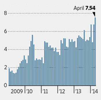 統計局周二發布的數據顯示,4月中國的日均粗鋼產量增長2%達到230萬噸的歷史新高。上個最高記錄則出現在本年3月。去年中國出口6230萬噸鋼材,僅低于2007年創下的記錄。