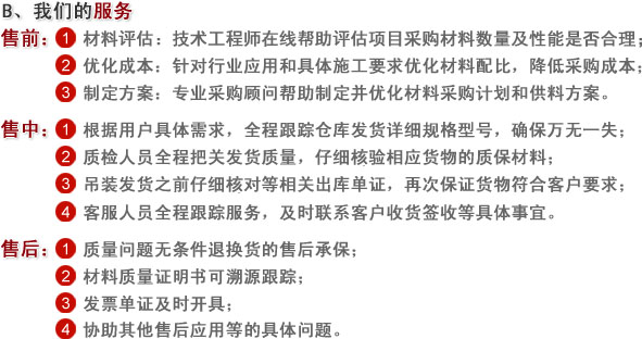 4、銷售和交貨方式便捷:提供送貨、自提、代辦運(yùn)輸、代加工等銷售和交貨方式供您選擇,幫您減少更多的物力、人力成本。